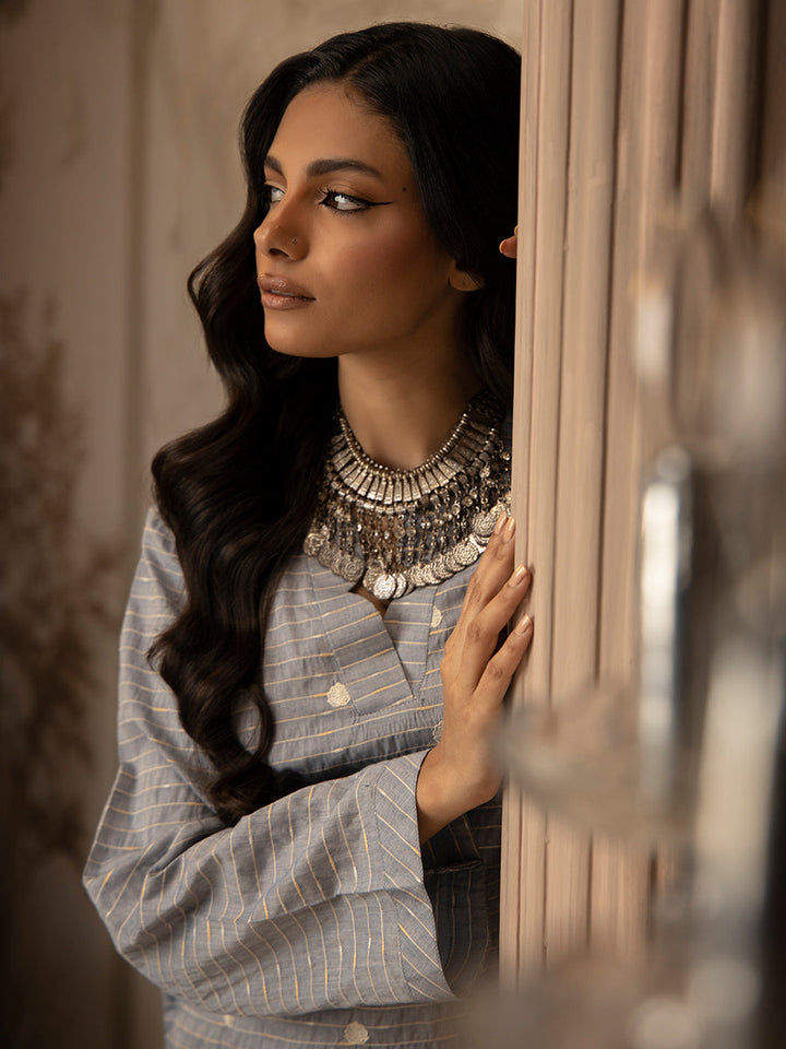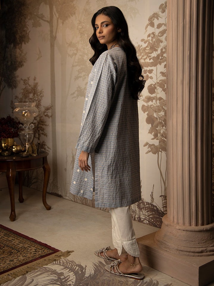 Step into subtle elegance with our blue-grey yarn-dyed shirt, featuring a gorgeous textured finish and delicate white floral embroidery. It is a perfect blend of minimalism and charm for a refined look.