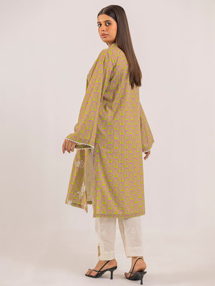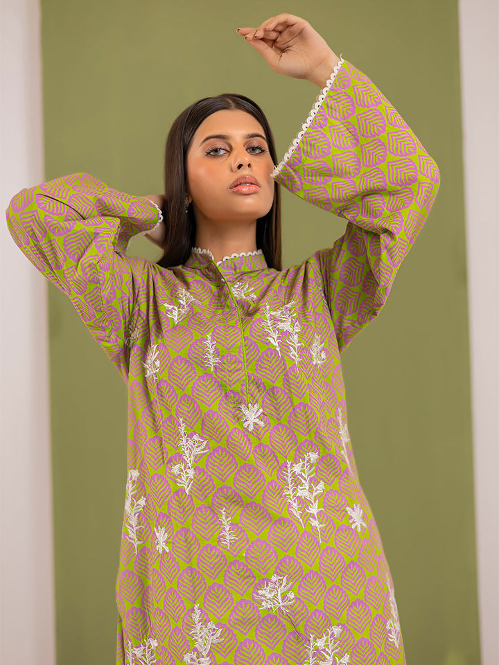 A gorgeous green and pink shirt featuring geometric prints and sophisticated white motifs, elegantly elevated with intricate white lace detailing.