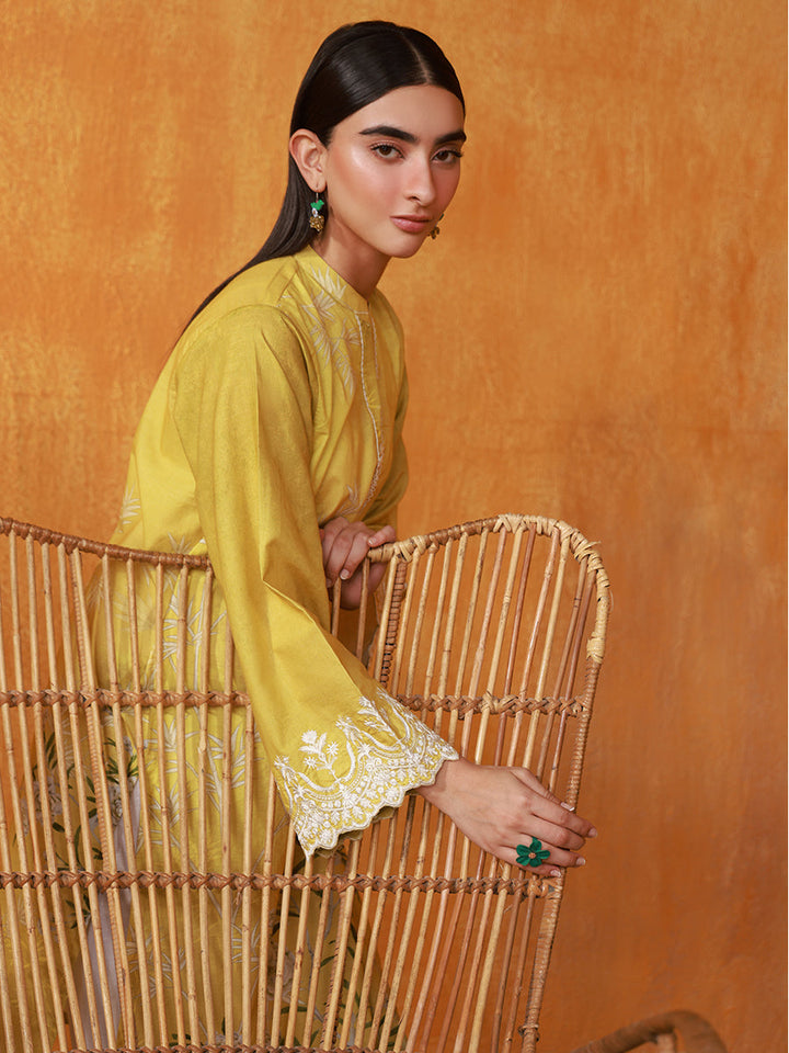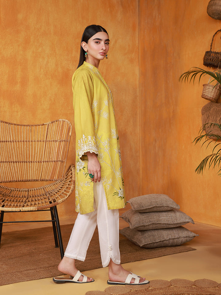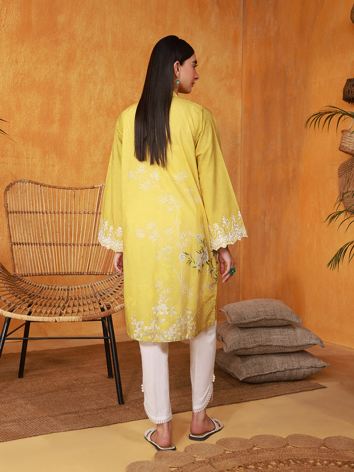 Brighten up your routine with this stunning yellow printed kurta, featuring exquisite embroidery and a refined band collar.