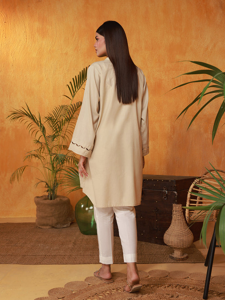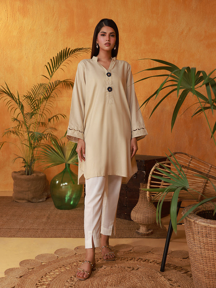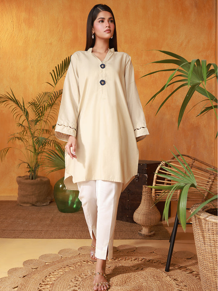 A perfect blend of professionalism and style: creamy beige kurta with button detailing for office wear