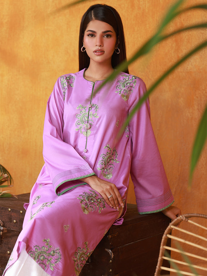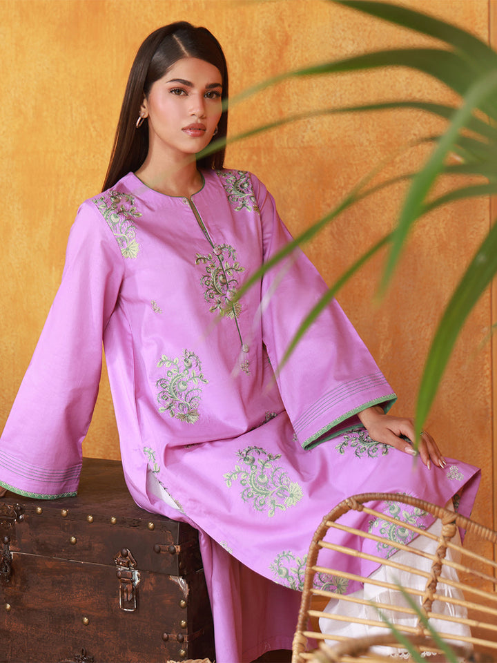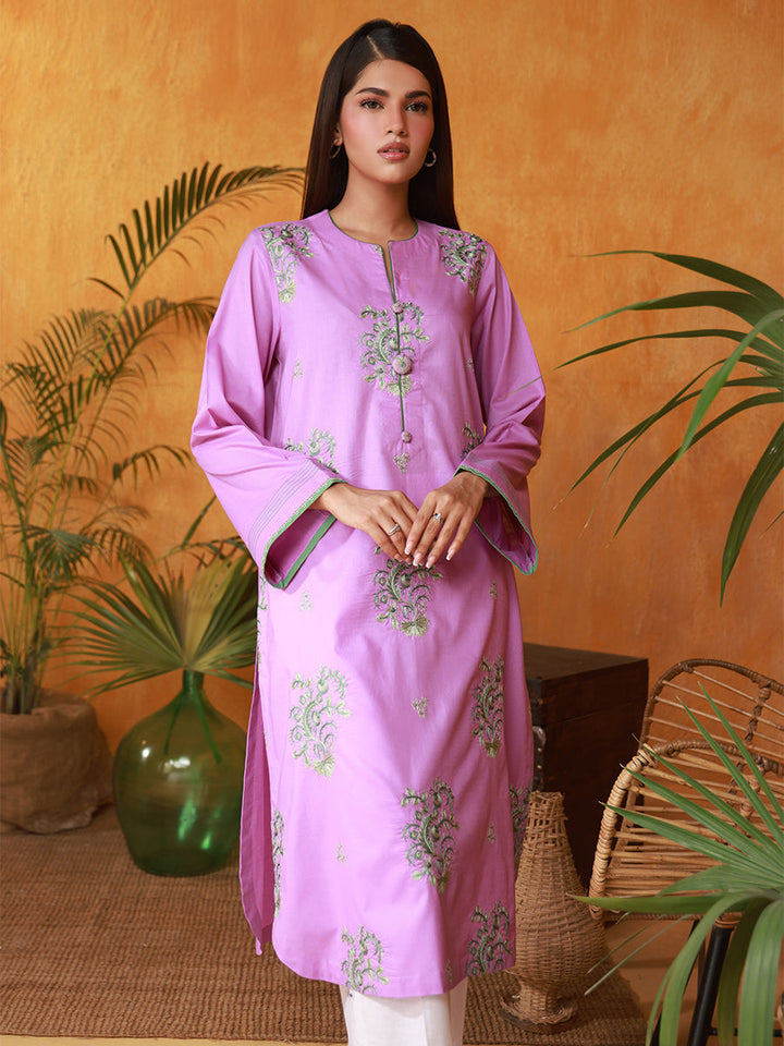 Discover elegance in our printed shirt featuring a band collar and running stitch on the sleeves, showcasing a captivating purple floral design on a crisp white background