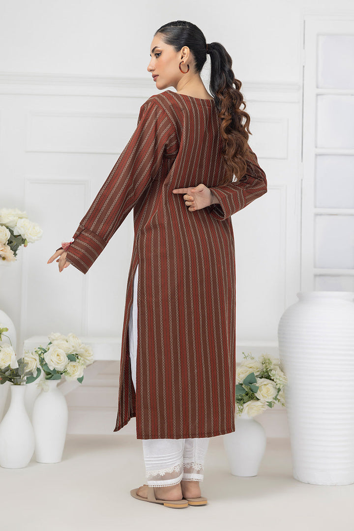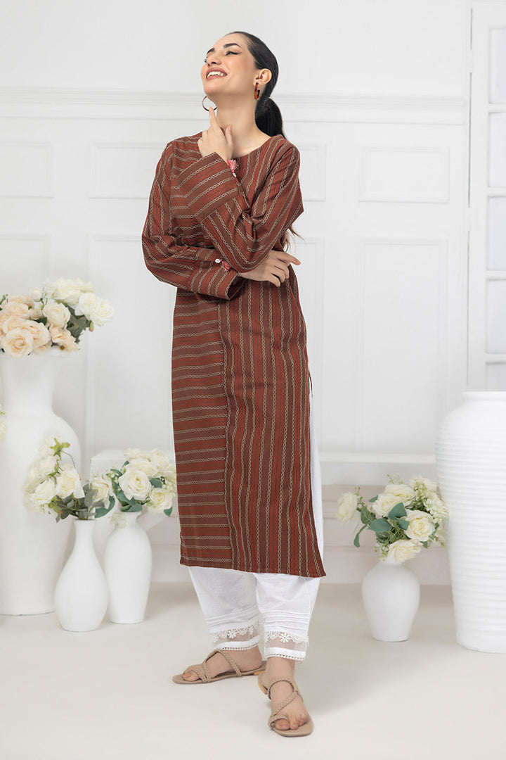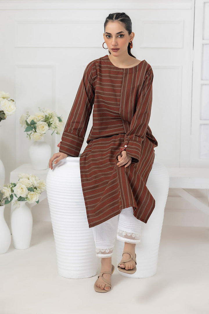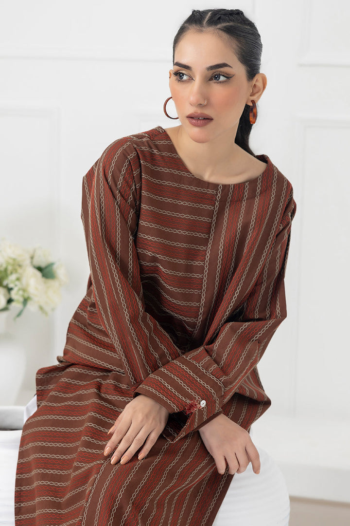 Unveil sophistication with our brown shirt, featuring a stylish boat neck and square armholes. The delicate embellishments add a touch of elegance, making it a standout piece for any occasion.