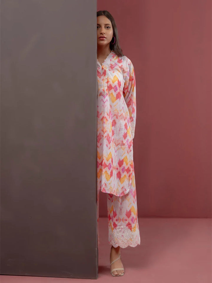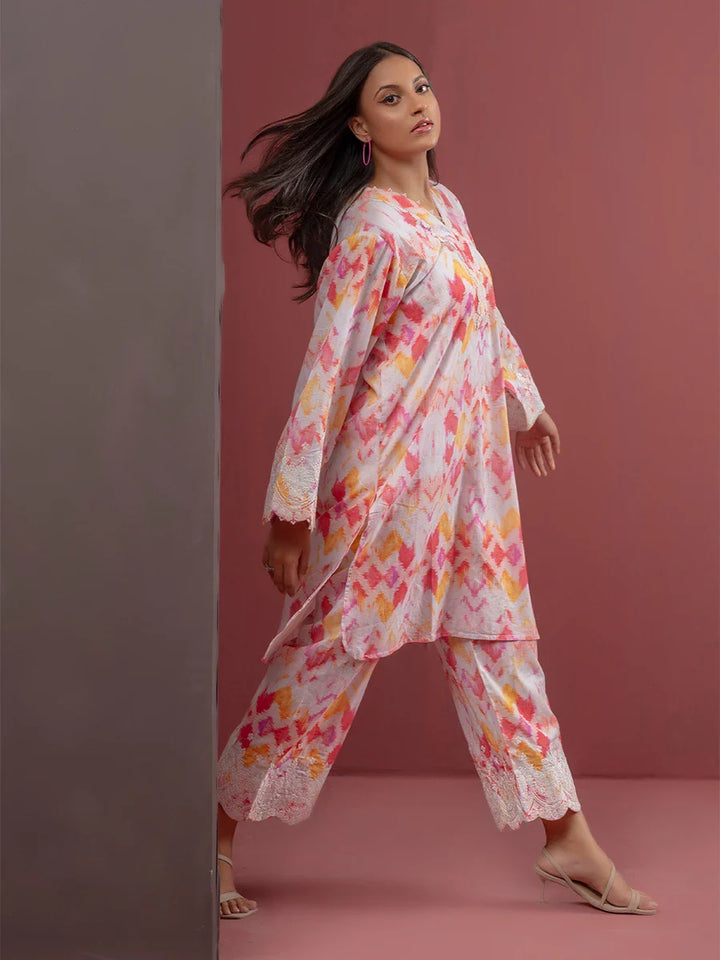Make a vibrant style statement with our co-ord set, featuring a stunning tie-dye print in red, yellow, and orange. Embroidery on the sleeves and pant hems, along with pearl details on the neckline and sleeves, add the perfect touch of elegance to this lively ensemble