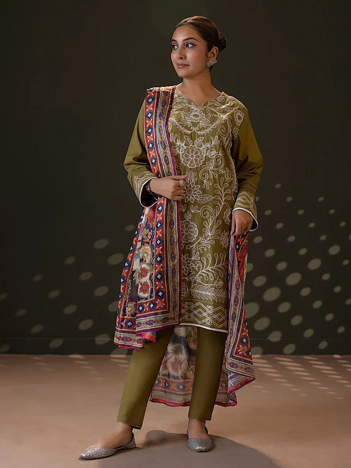 Chic 3-piece set: cambric shirt & trouser with a silk zari dupatta in elegant olive. Lightweight, breathable, & perfect for a stylish, graceful look.