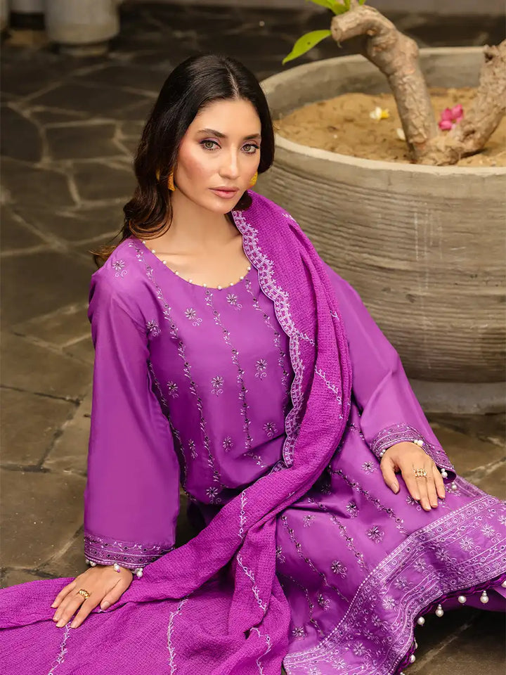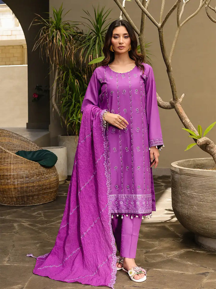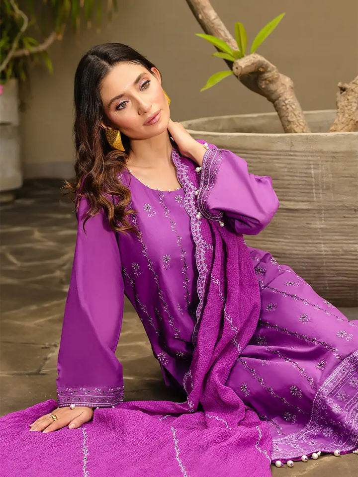 A stylish outfit featuring an embroidered lawn shirt, paired with an embroidered dupatta and a plain cambric trouser. Designed to offer comfort and elegance for any occasion, it's a versatile choice for Casual or festive Wear.