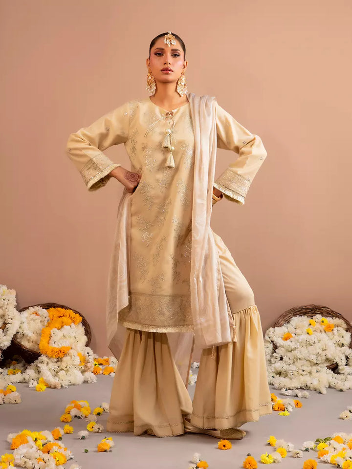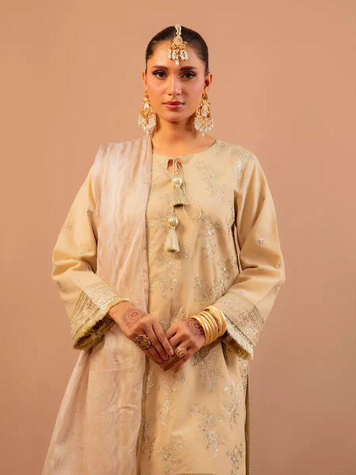 Celebrate tradition with our 3PC unstitched festive embroidered suit, crafted from premium fabric with elegant embroidery a versatile and stylish pick for any occasion.