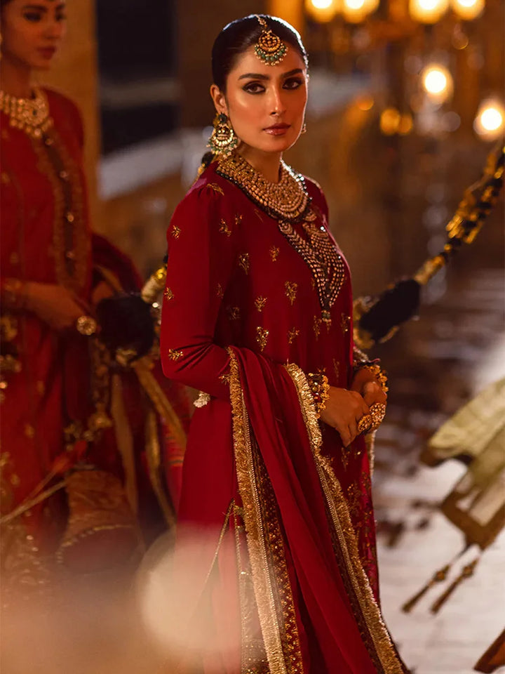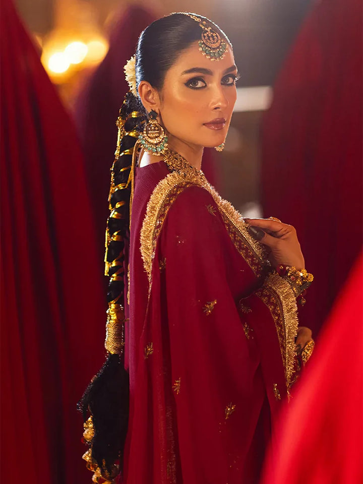 Ayeza Khan emanates graceful serenity in this ruby-red chiffon piece embellished with delicate floral Zari sequin embroidery elegantly paired with dyed crêpe silk lowers and a side chiffon dupatta with Zari sequin embroidery on the pallu.
