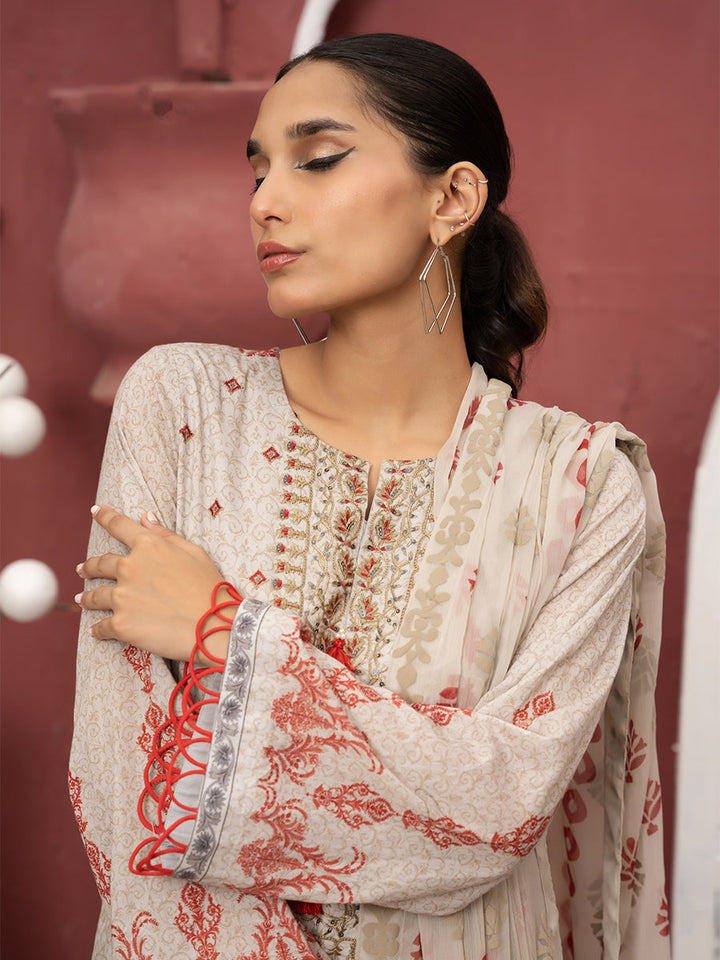 3-piece unstitched lawn outfit featuring a printed and embroidered shirt paired with a chiffon screen-printed dupatta.