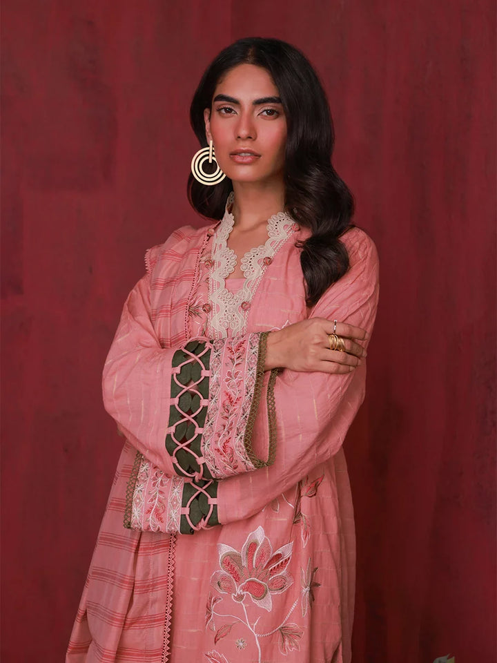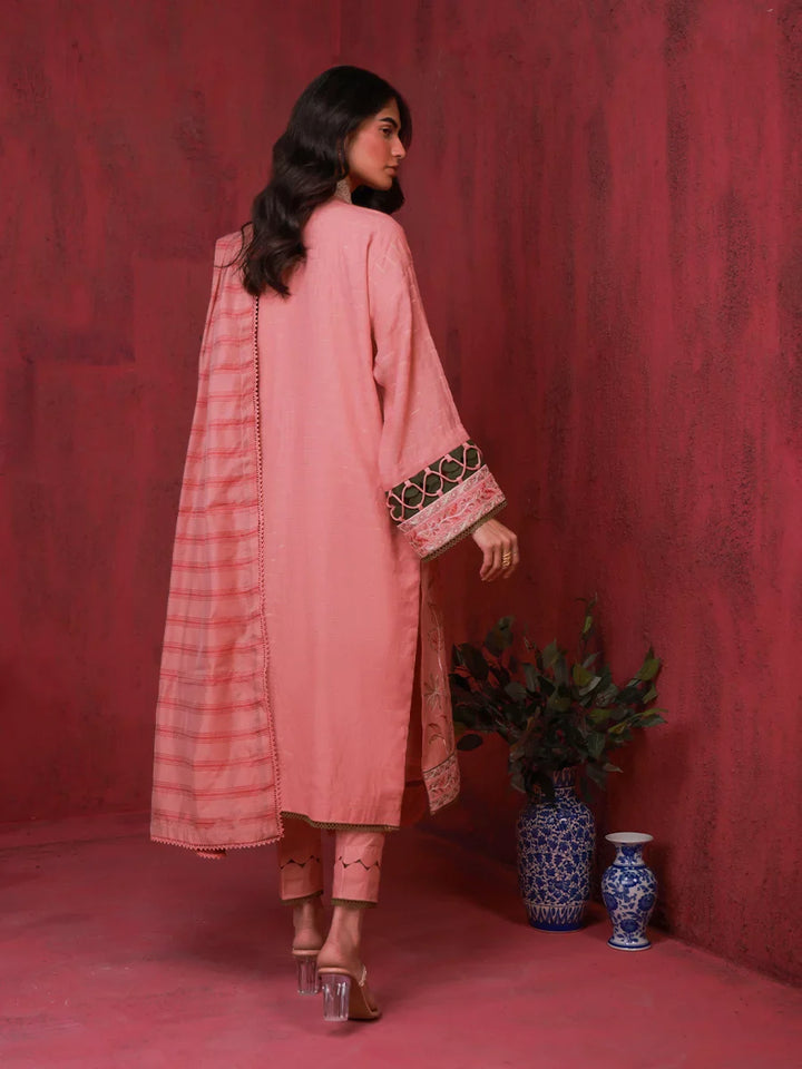 Radiant inflorescent blush pink, this three-piece ensemble captivates with intricate embroidery, a symphony of elegance and vibrancy in every stitch.
