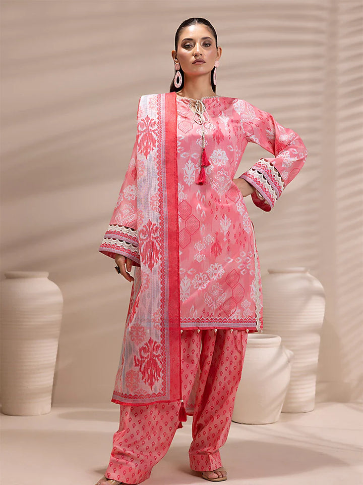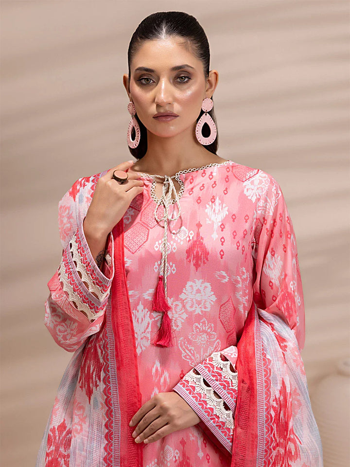 Elegant 3-piece suit in premium printed lawn silk. Includes a breathable shirt, trousers, and a lightweight dupatta. Perfect for any occasion.