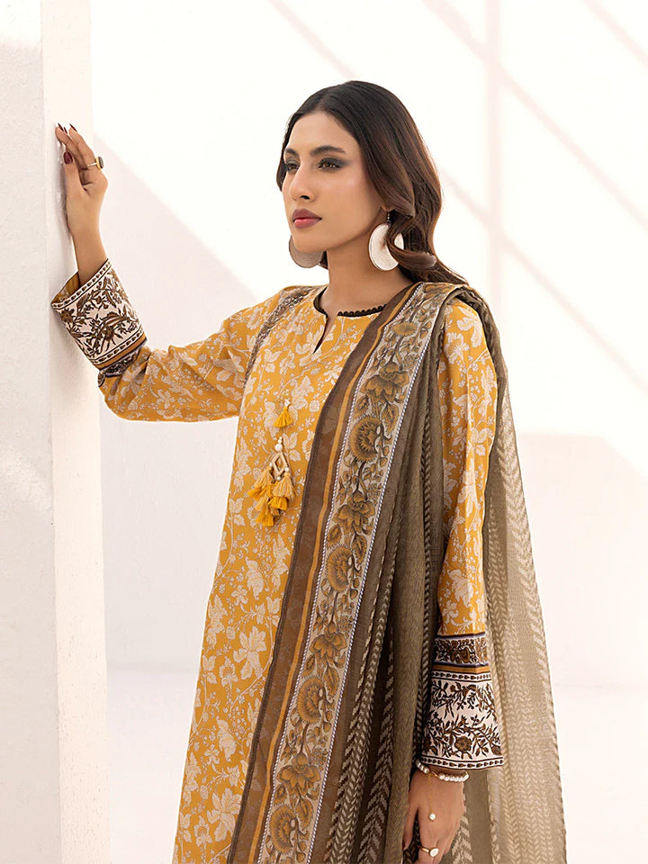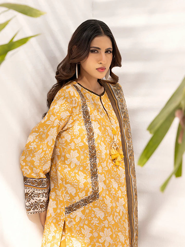 Elegant 3-piece suit in premium printed lawn silk. Includes a breathable shirt, matching trousers, and lightweight dupatta. Perfect for any occasion