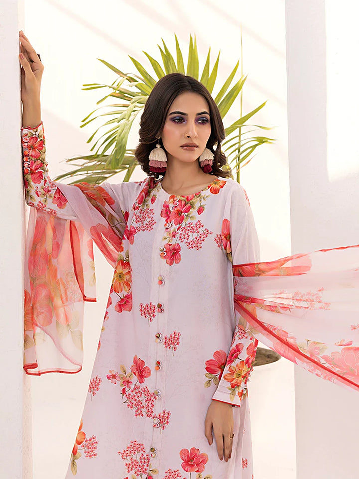 Elegant 3-piece suit in premium printed lawn silk. Includes a breathable shirt, matching trousers, and lightweight dupatta. Perfect for any occasion