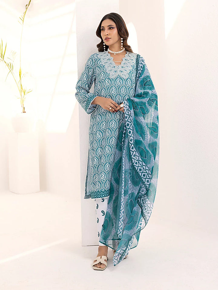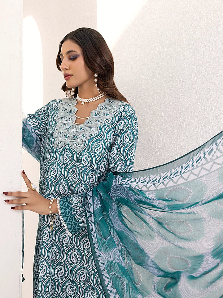 Elegant 3-piece suit in premium printed lawn silk. Includes a breathable shirt, matching trousers, and lightweight dupatta. Perfect for any occasion