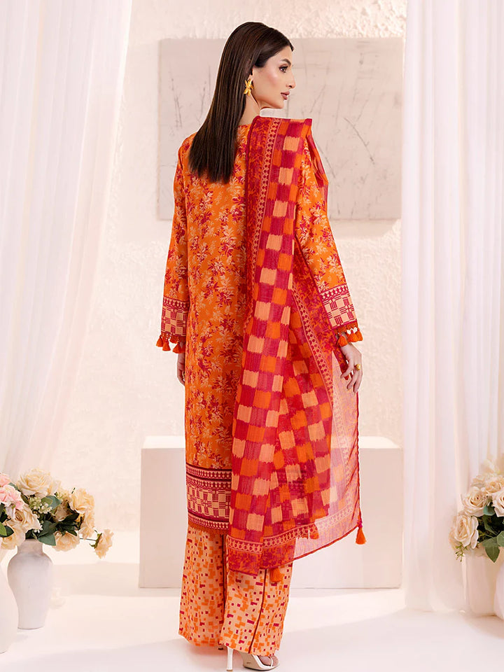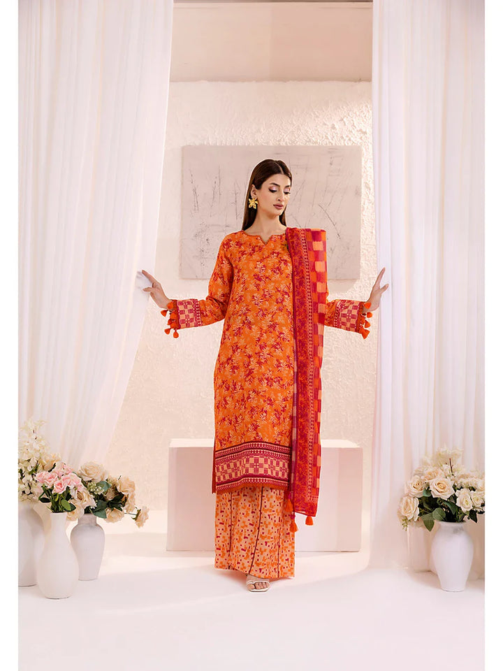 Elegant 3-piece suit in premium printed lawn silk. Includes a breathable shirt, trousers, and a lightweight dupatta. Perfect for any occasion.