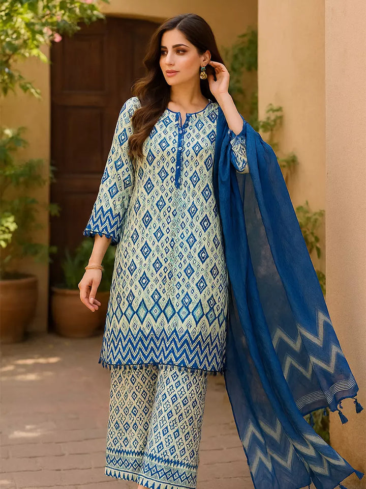 Elegant 3-piece suit in premium printed lawn silk. Includes a breathable shirt, trousers, and a lightweight dupatta. Perfect for any occasion.