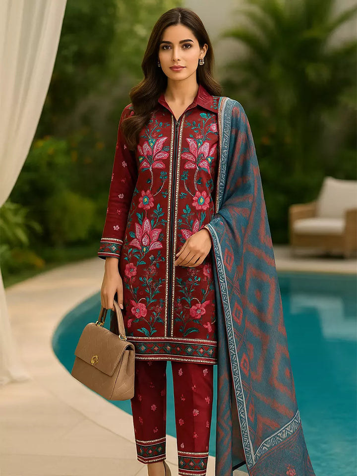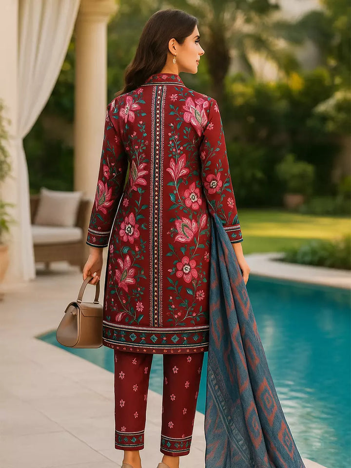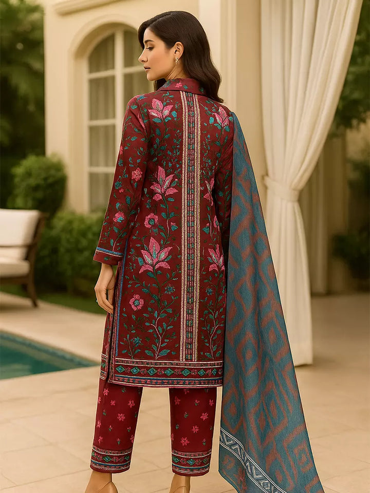 Elegant 3-piece suit in premium printed lawn silk. Includes a breathable shirt, trousers, and a lightweight dupatta. Perfect for any occasion.