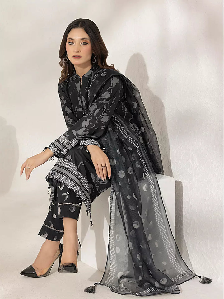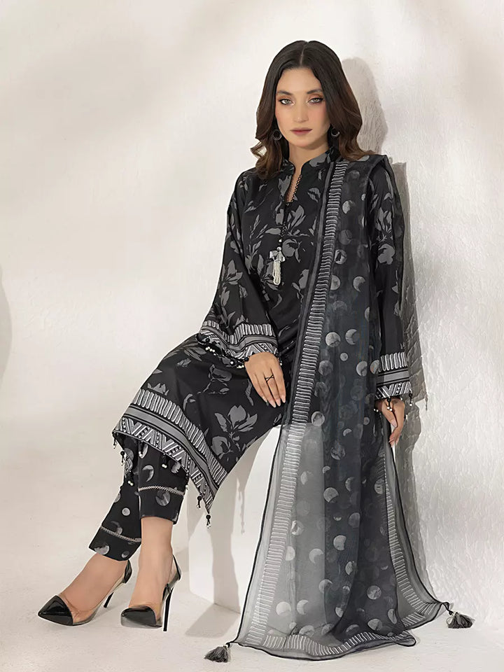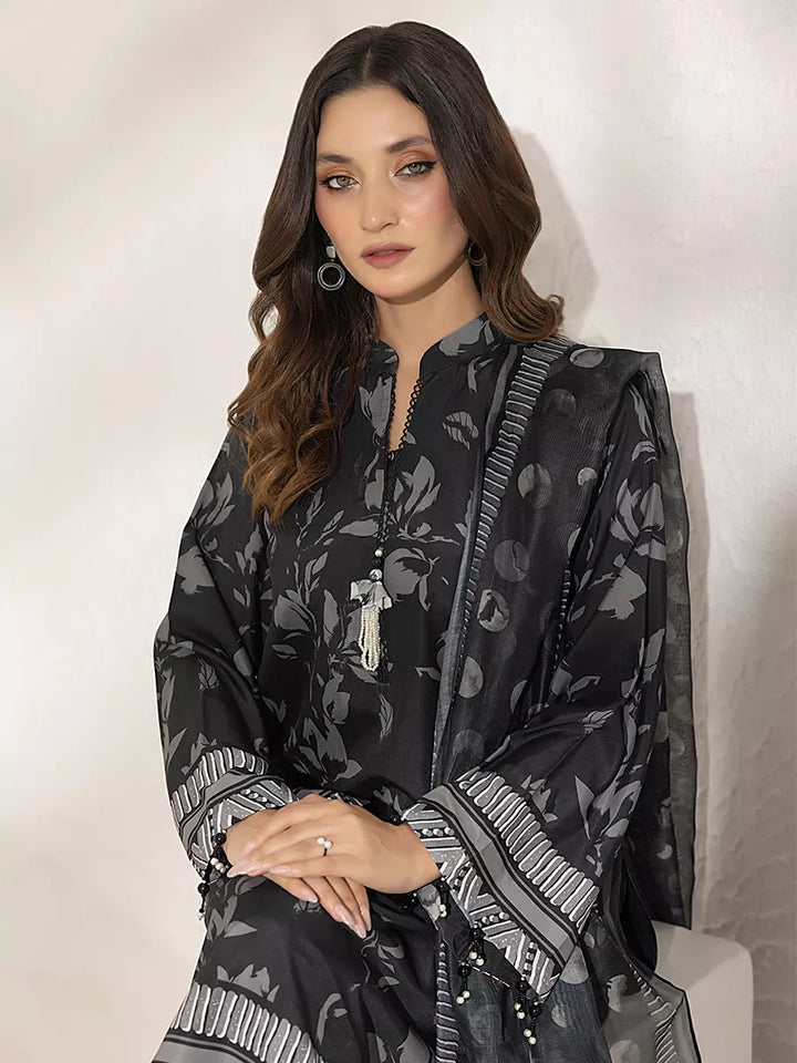 Elegant 3-piece suit in premium printed lawn silk. Includes a breathable shirt, trousers, and a lightweight dupatta. Perfect for daily wear.