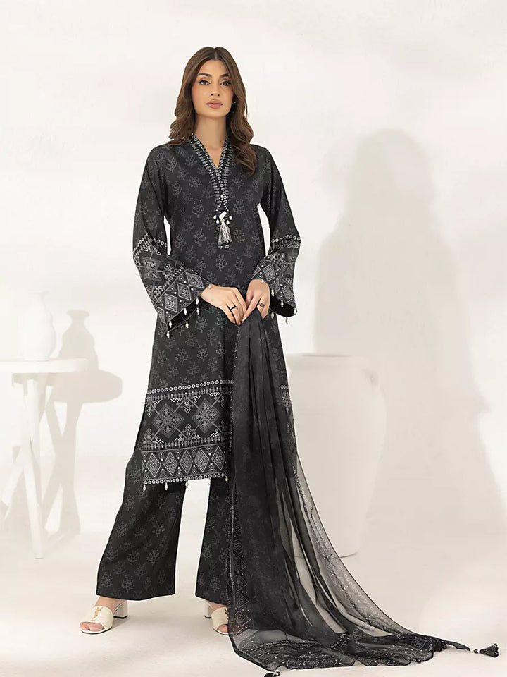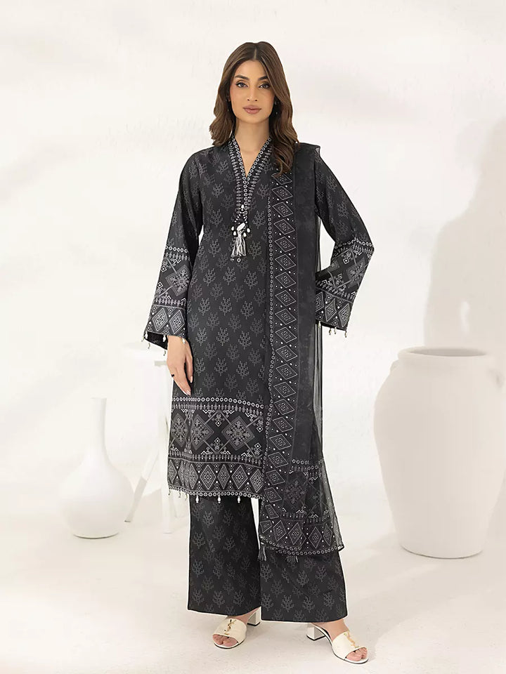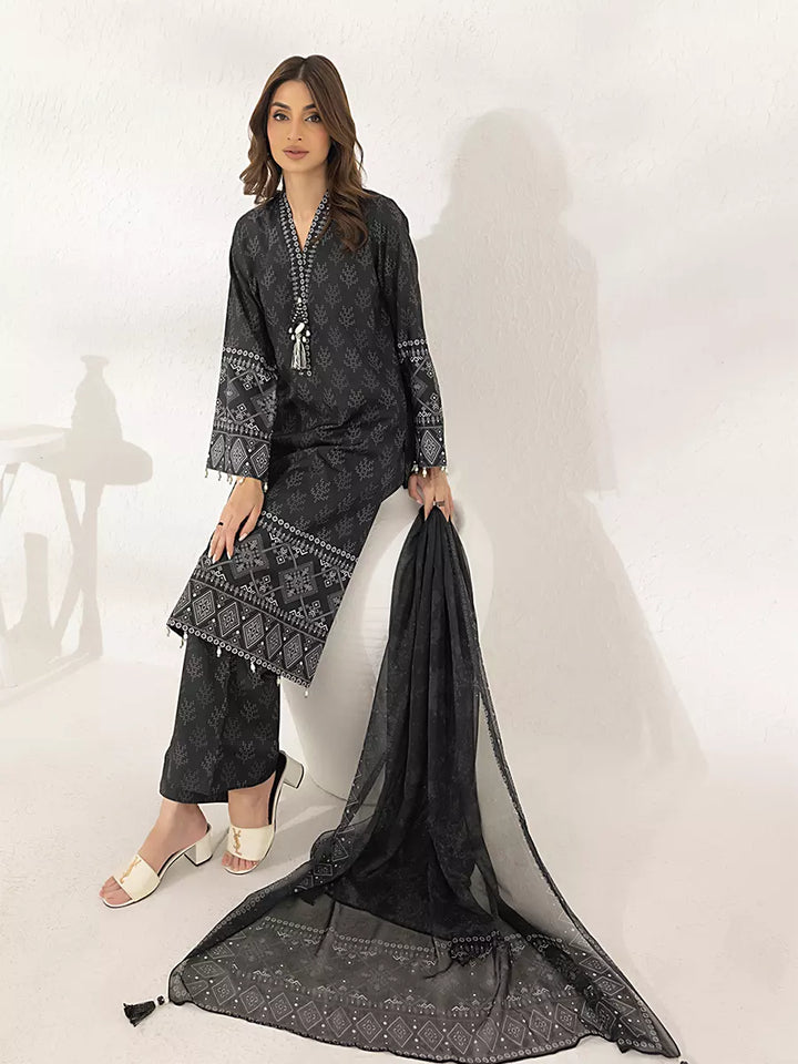 Elegant 3-piece suit in premium printed lawn silk. Includes a breathable shirt, trousers, and a lightweight dupatta. Perfect for daily wear.