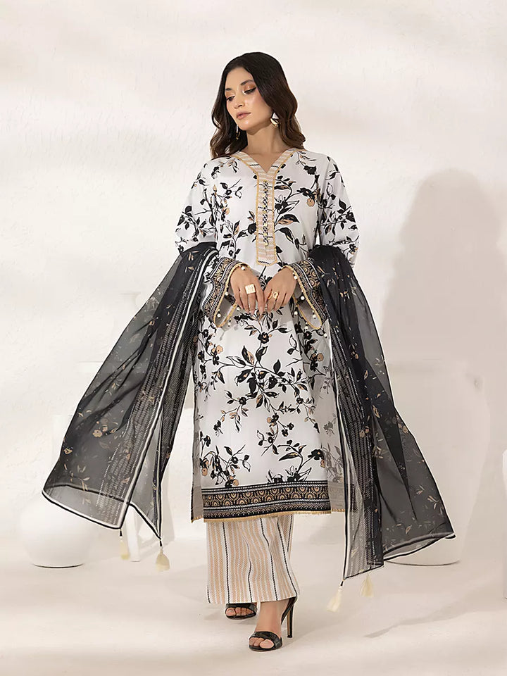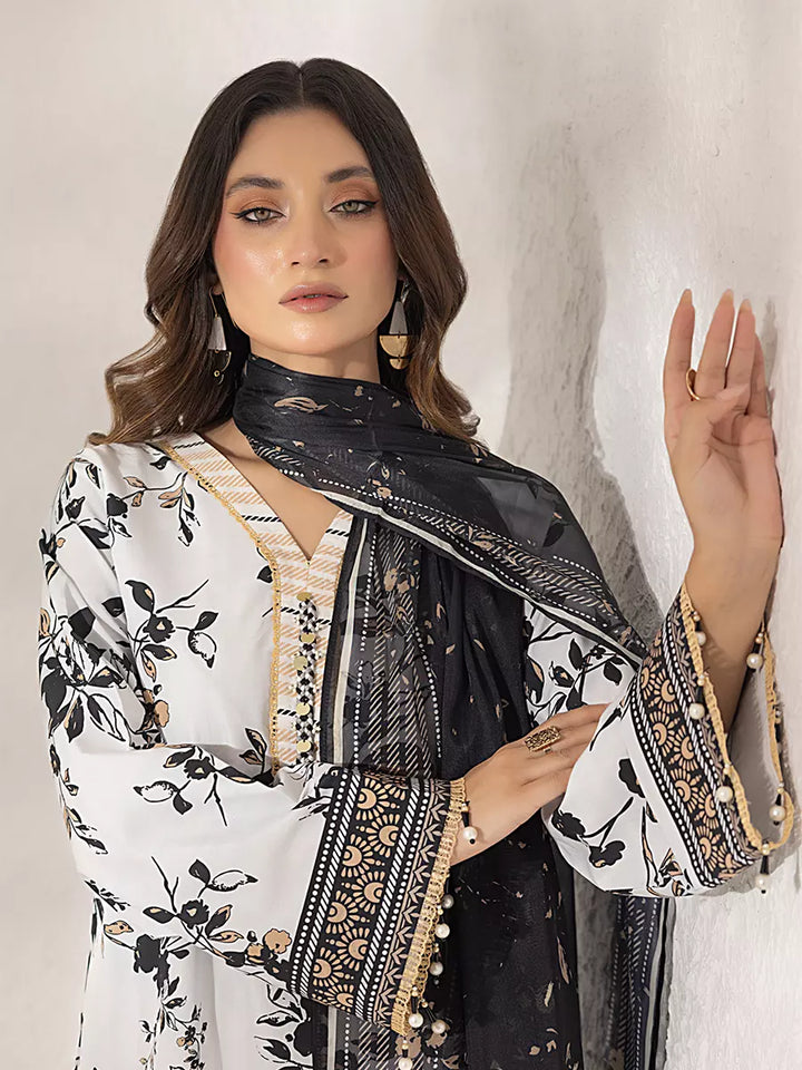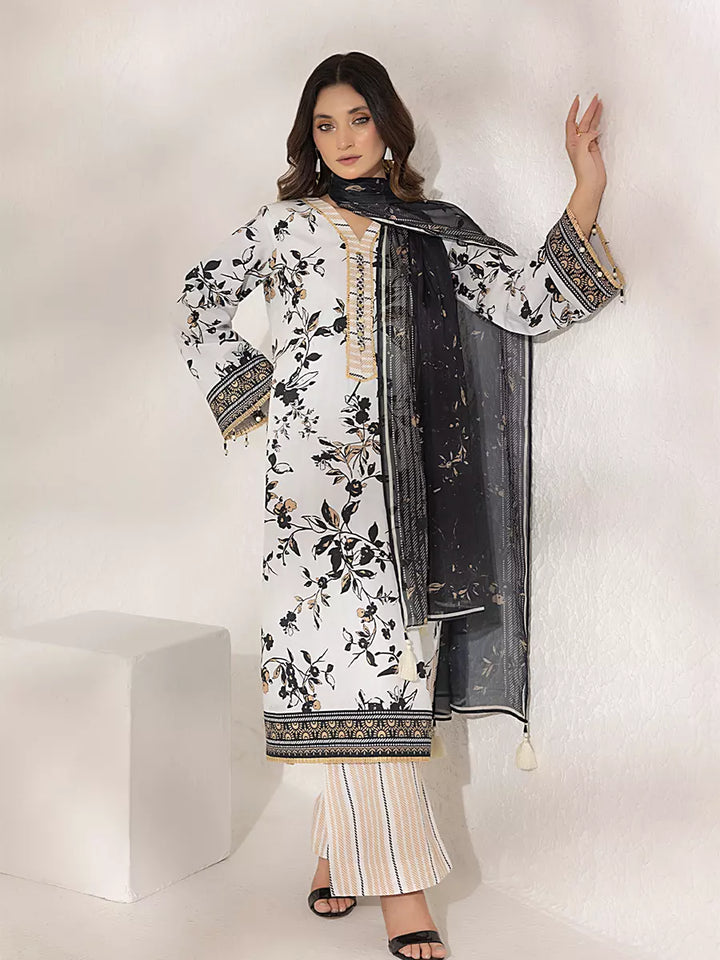 Elegant 3-piece suit in premium printed lawn silk. Includes a breathable shirt, trousers, and a lightweight dupatta. Perfect for daily wear.