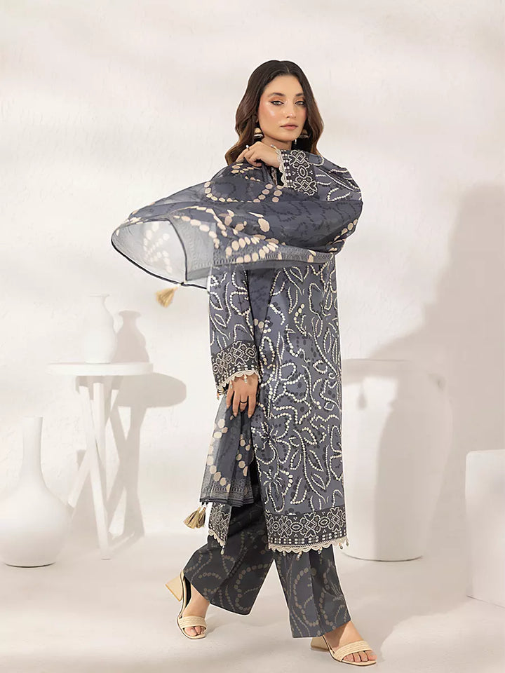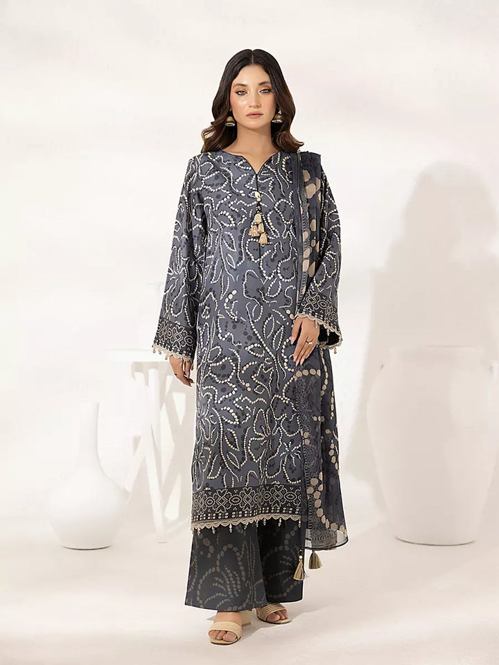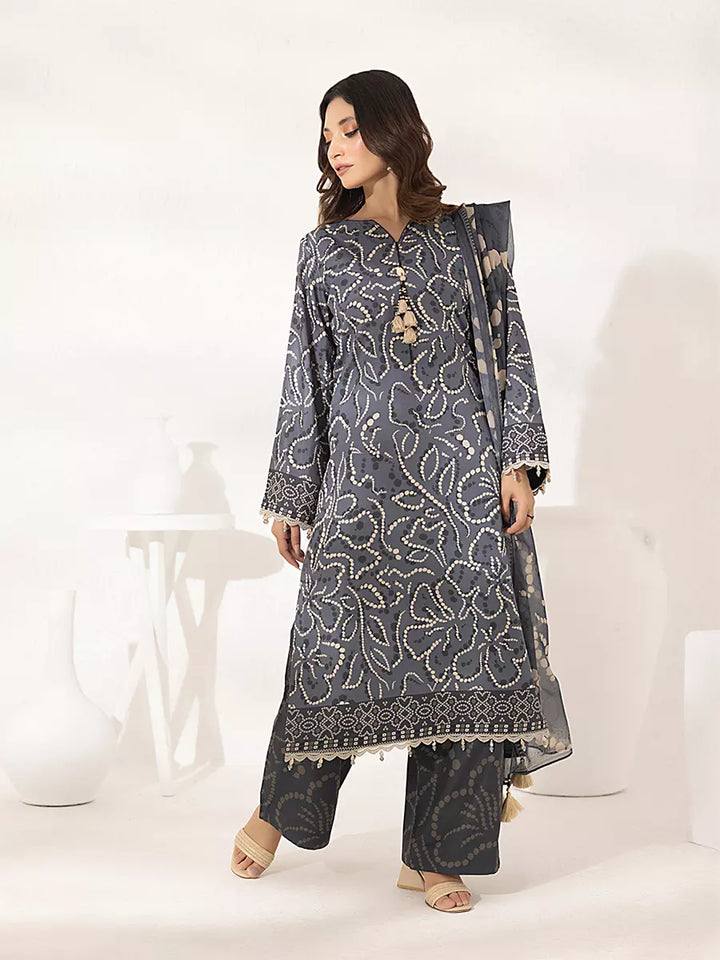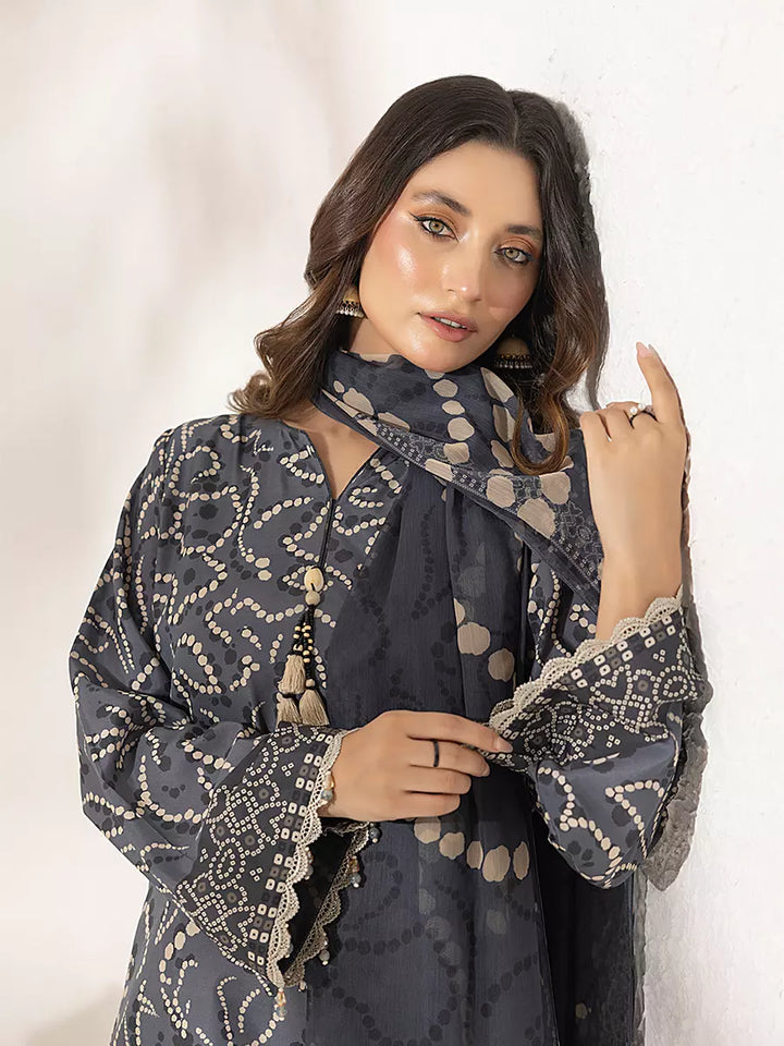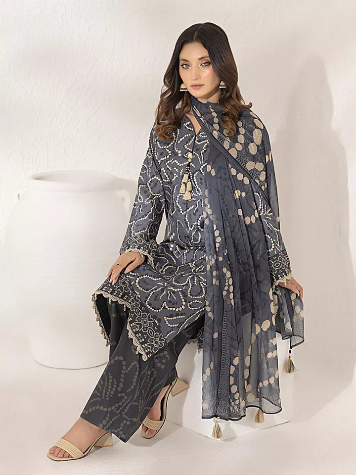 Elegant 3-piece suit in premium printed lawn silk. Includes a breathable shirt, trousers, and a lightweight dupatta. Perfect for daily wear.