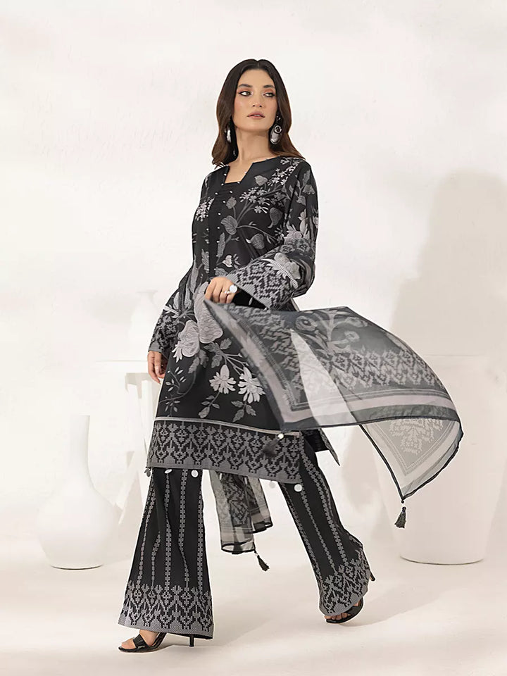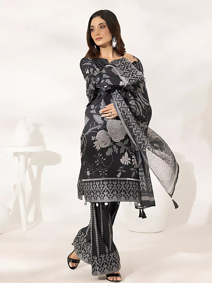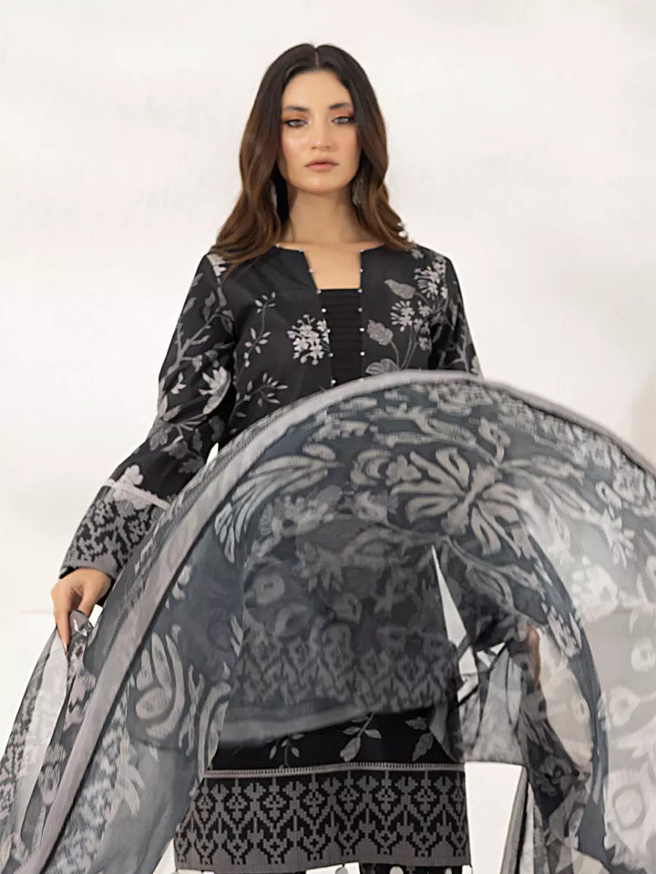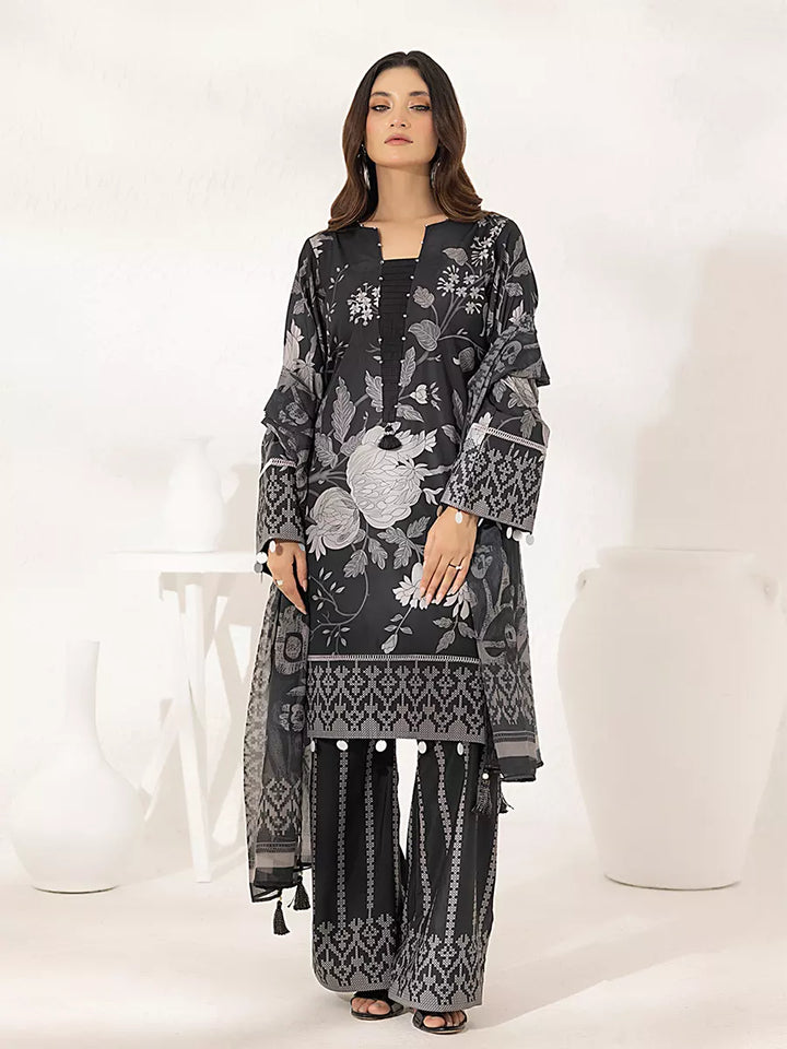 Elegant 3-piece suit in premium printed lawn silk. Includes a breathable shirt, trousers, and a lightweight dupatta. Perfect for daily wear.