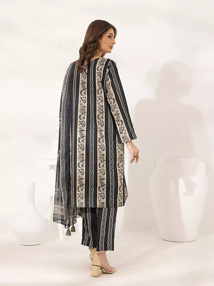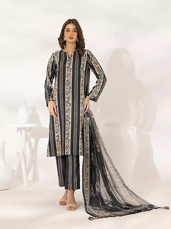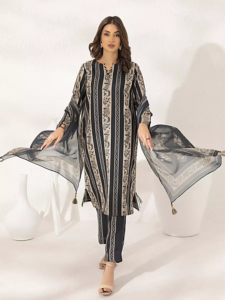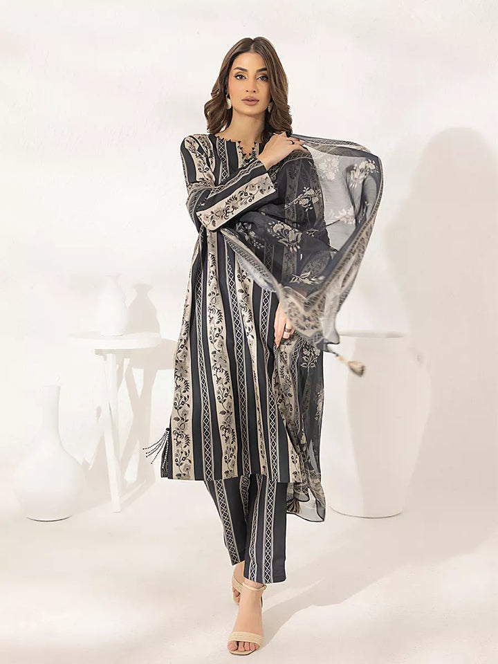 Elegant 3-piece suit in premium printed lawn silk. Includes a breathable shirt, trousers, and a lightweight dupatta. Perfect for daily wear.