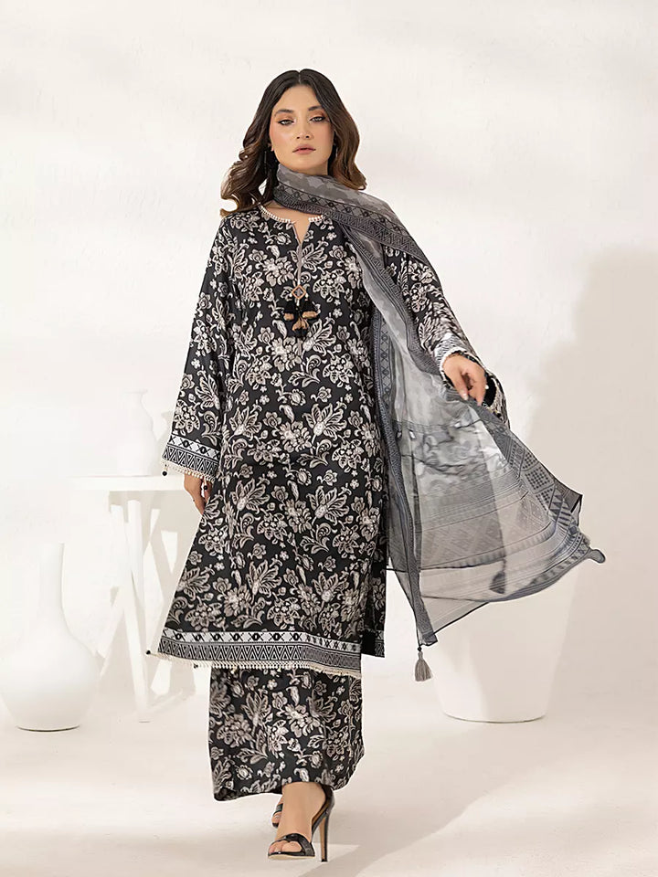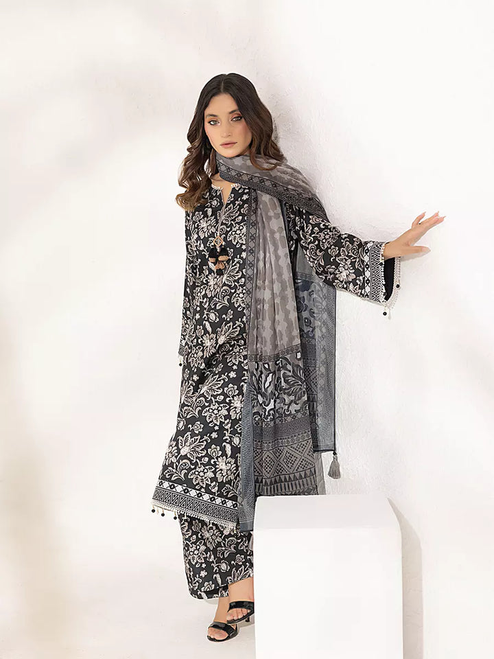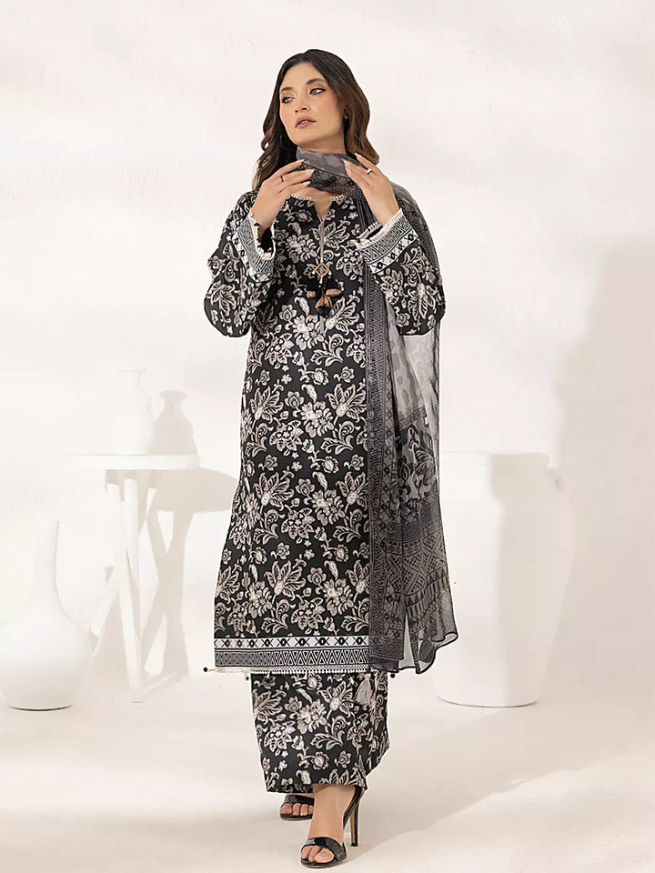 Elegant 3-piece suit in premium printed lawn silk. Includes a breathable shirt, trousers, and a lightweight dupatta. Perfect for daily wear.