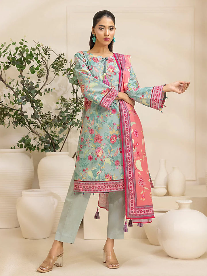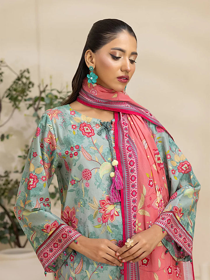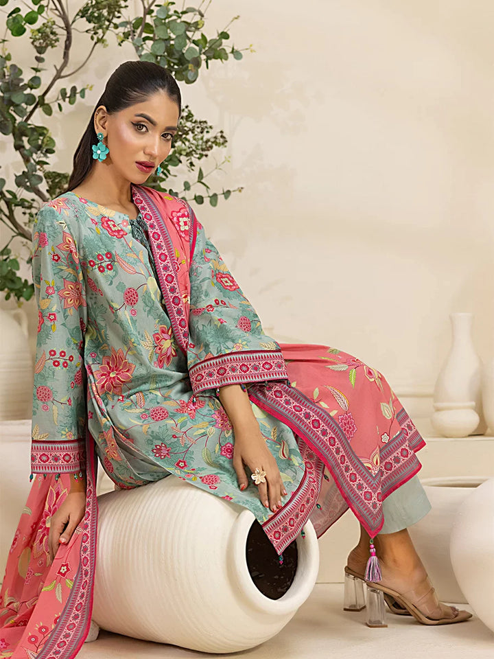 Brighten up your wardrobe with our 3-Piece Unstitched Lawn Collection. Featuring a vibrant printed shirt, cambric dyed trouser, and a beautifully printed dupatta.