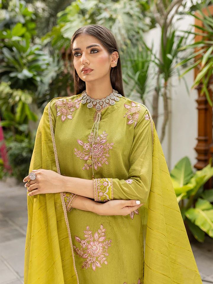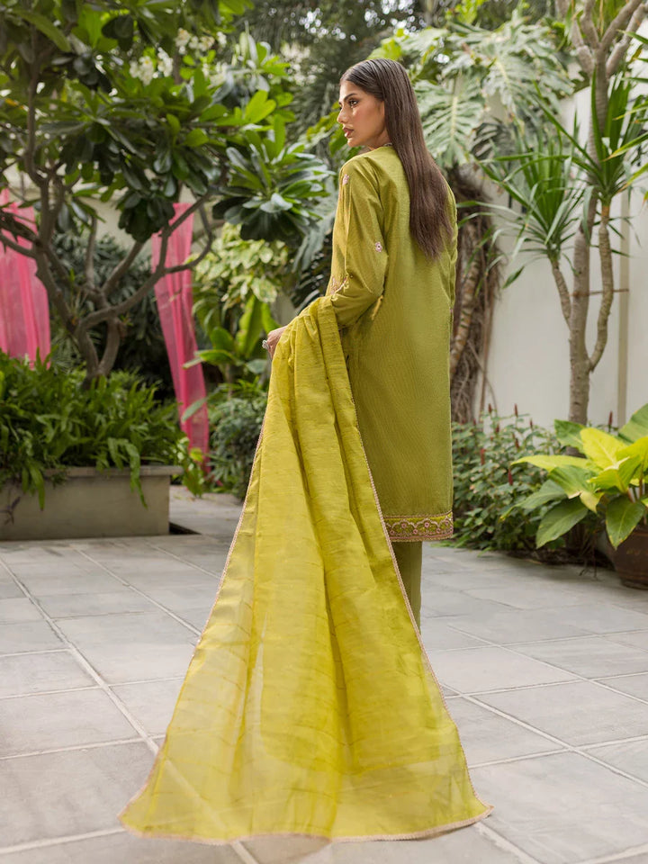 Step into effortless grace with our straight-cut shirt and lace-detailed pants, perfectly complemented by a yarn-dyed dupatta in a gorgeous Dhani green. A flawless blend of elegance and charm for your wardrobe