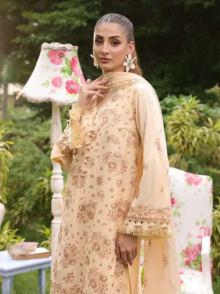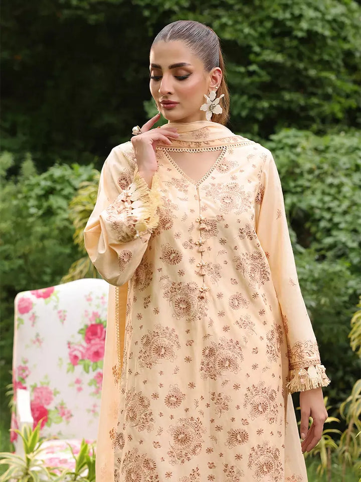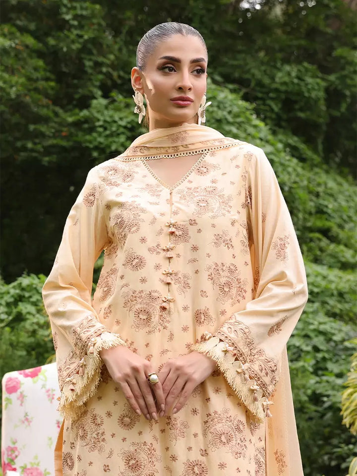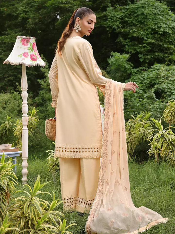 Step into subtle sophistication with our pale banana cambric dyed 3-piece, beautifully enhanced with delicate chikankari embroidery—your ultimate style essentia