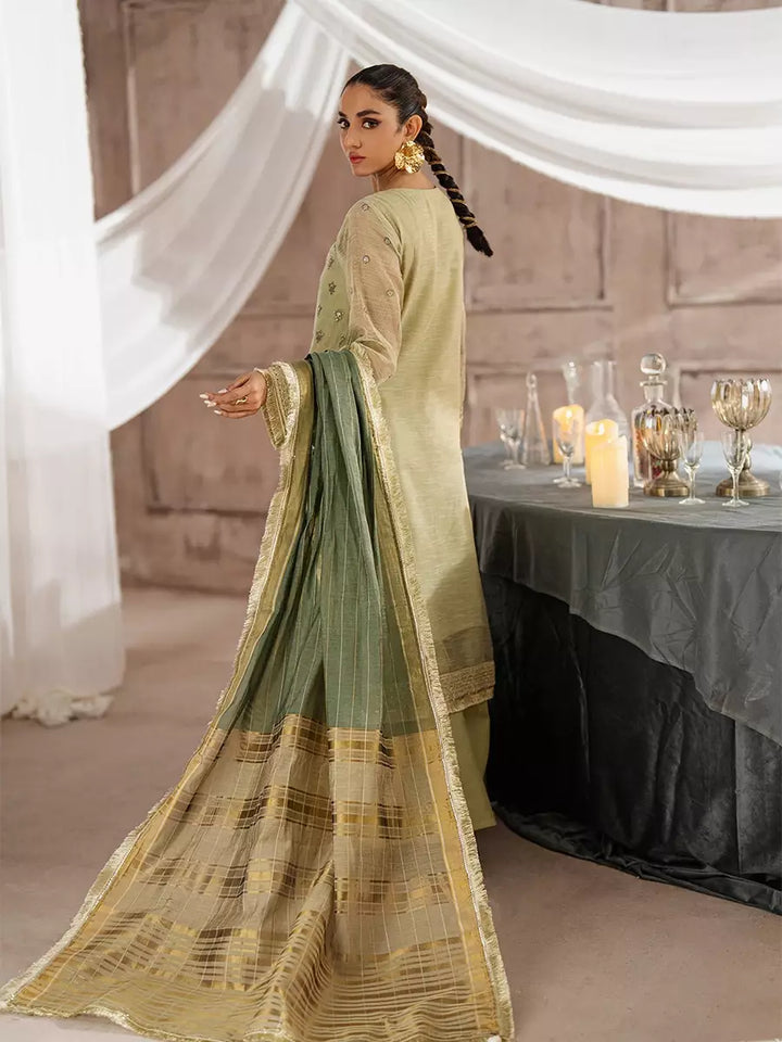 Luxury embroidered net front with dori and sequin detailing, paired with dyed lurex cotton net back, side panels, and sleeves featuring intricate embroidery. Includes an embroidered net embellished dupatta, plain crape trousers, and beautifully embroidered borders for a sophisticated finish.