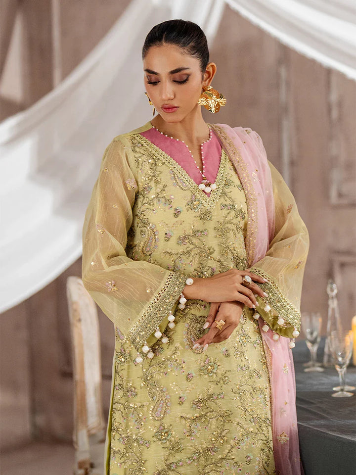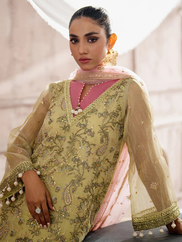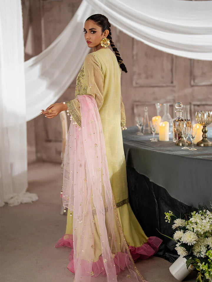 Luxury embroidered net front with dori and sequin detailing, paired with dyed lurex cotton net back, side panels, and sleeves featuring intricate embroidery. Includes an embroidered net embellished dupatta, plain crape trousers, and beautifully embroidered borders for a sophisticated finish.