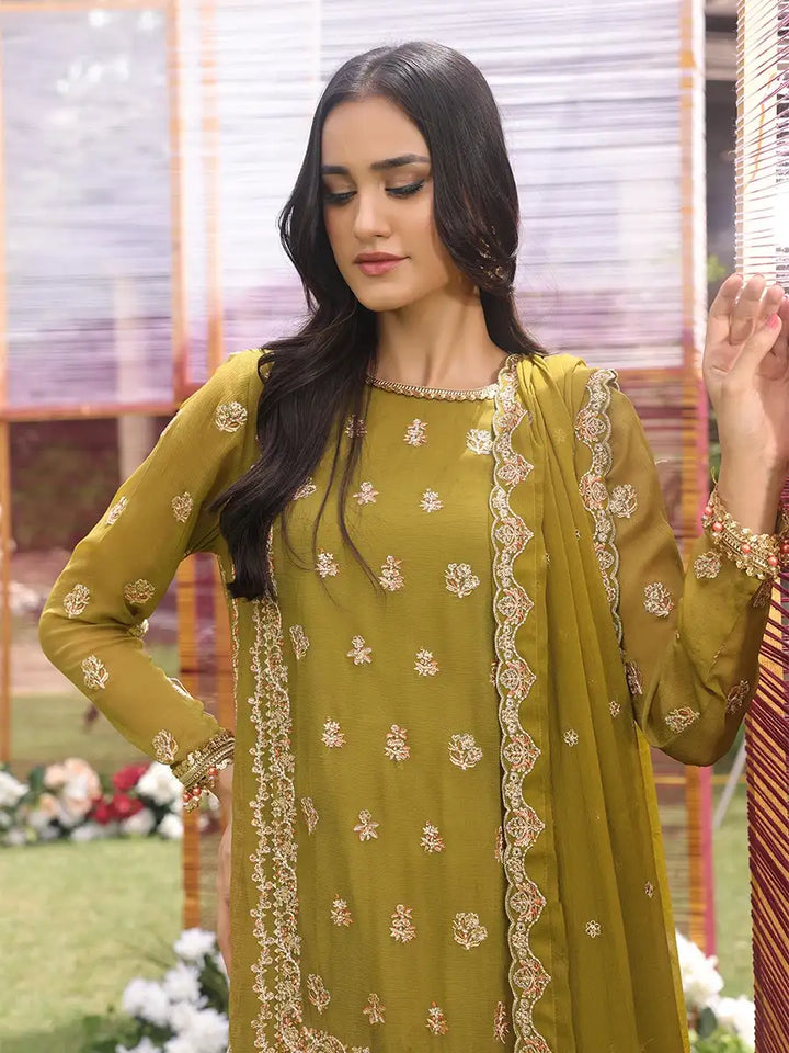 Celebrate tradition in our mehndi green chiffon ensemble, beautifully adorned with intricate zari and sequin work—perfect for a rich and festive look