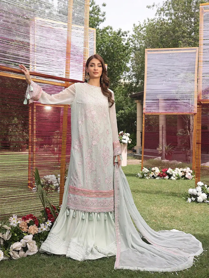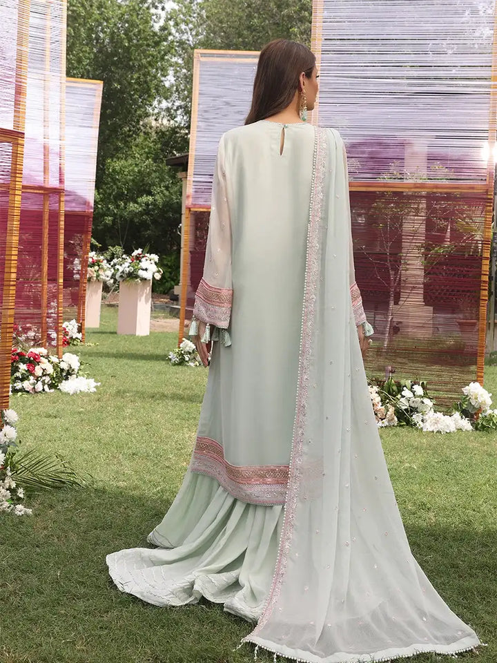 Embrace elegance in our pastel green chiffon ensemble, delicately embellished with zari and sequins—ideal for a soft, festive touch
