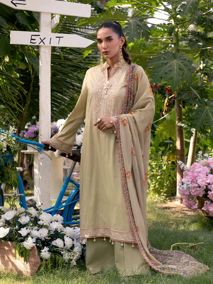 Embody elegance with this pastel green 3-piece unstitched suit, featuring delicate front embroidery and a lovely printed dupatta. A perfect choice for a fresh and graceful look at an affordable price